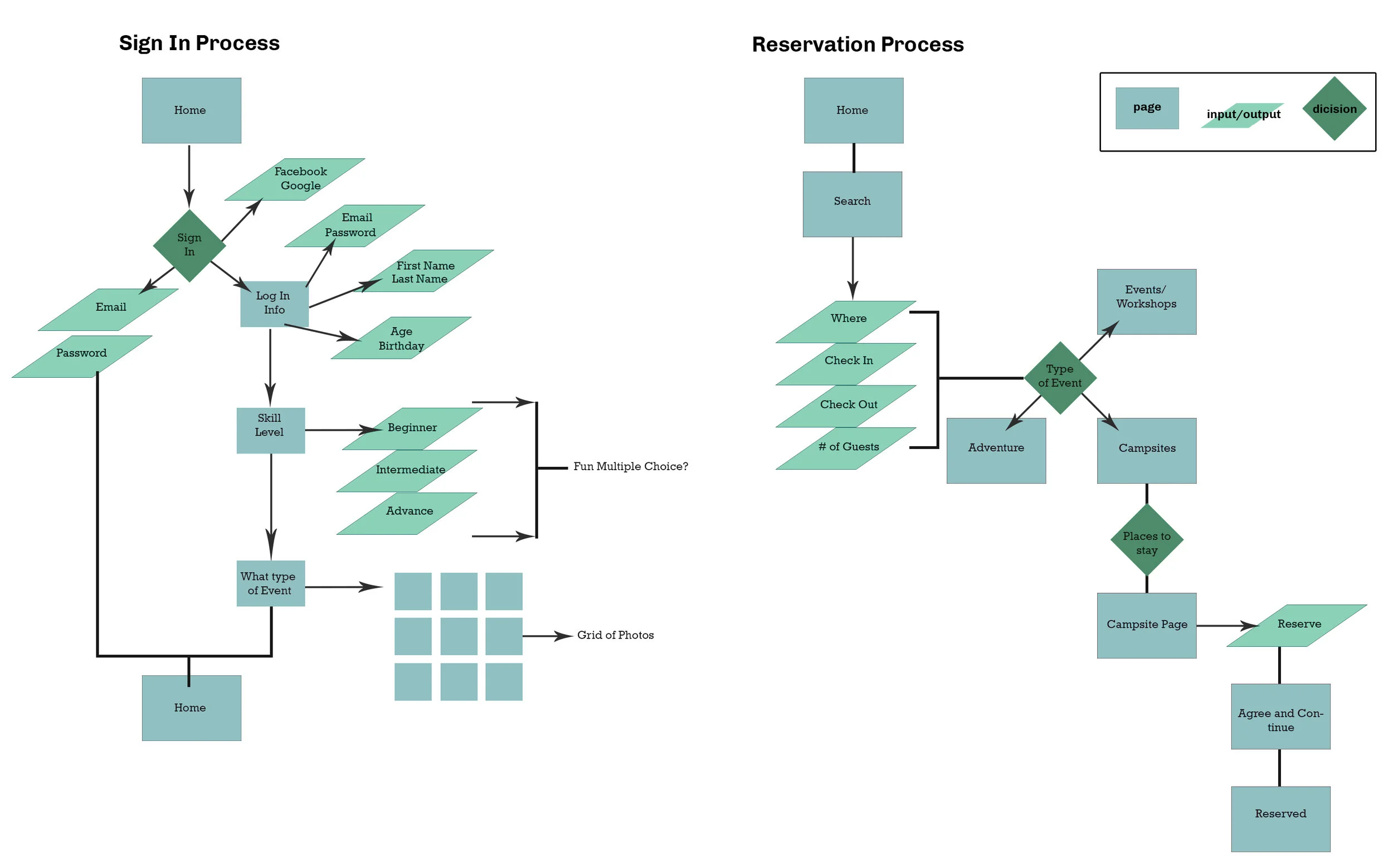 I dove into the information architecture. From that came a flow chart of the decisions or pivot points a user would have to make while navigating the sign up and reservation process. I picked these two routes to navigate because I felt that they were the most important goals of the app to be achieved.